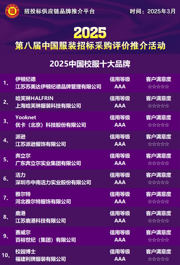 ——立异驱动将来,质量引领行业近日,为鞭策我国服拆行业尺度化、智能化取绿色化转型成长,招投标供应链品牌推介平台举办了2025(第八届)中国服拆投标采购评价推介勾当,发布了“2025中国校服十大品牌”榜单。伊顿纪德、哈芙琳HALFRIN、Yooknet、派逊、奔立尔、活力、雅尔特、鹿港、赛威尔、校园博。。?。