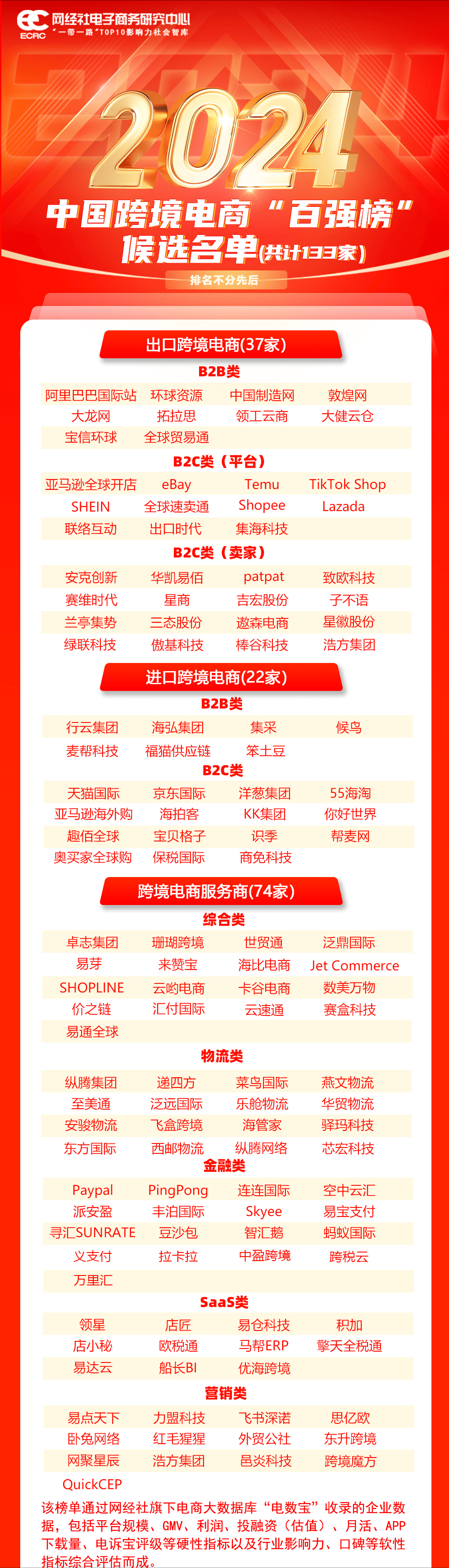;2)物流类:纵腾集团、递四方、菜鸟国际、燕文物流、至美通、泛远国际、乐舱物流、华贸物流、安骏物流、飞盒跨境、海管家、驿玛科技;3)金融类:Paypal、PingPong、连连国际、空中云汇、派安盈、丰泊国际、Skyee、易宝领取、寻汇SUNRATE、豆沙包、智汇鹅、蚂蚁国际、义领取、拉卡拉;4)SaaS类:领星、店匠、易仓科技、积加、店小秘、欧税通、马帮ERP、擎天全税通、力盟科技、飞书深诺、思亿欧、卧兔收集、红毛猩猩、外贸。【小贴士】。