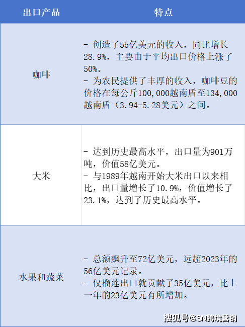 台风摩羯对2024年越南经济发生了严沉影响,了越南北部地域的社会经济勾当,结合国开辟打算署(UNDP)的最新研究演讲了此次台风形成的财务和经济丧失。虽然遭到台风的影响,越南经济正在2024年仍连结强劲增加。沉建和恢复工做鞭策了建建材料、零售和物流等行业的需求添加,为这些部分带来了新的机缘。2024年,消费者物价指数(CPI)上涨3。63%,合适方针。12月份,CPI同比上涨0。29%,次要受医疗办事、租赁住房和燃料价钱上涨鞭策。不包罗食物和能源等波动较大项目标焦点通缩率正在2024年上涨了2。71%,低于全体CPI的平均涨幅。2024年,越南的商业总额达到7862。9亿美元,同比增加15。4%,创下了247。7亿美元的商业顺差新高。2024年,越南的出口表示显著苏醒,37个沉点出口项目均跨越10亿美元,占总出口额的94。3%。此中8个品种的出口额跨越100亿美元,占总出口额的69%。这一增加标记着从2023年的4。6%下降中大幅反弹。越南的月平均出口额约为300亿美元,超越了中国、韩国、泰国和印度尼西亚等地域同业,这些国度同期的出口增加率正在1。33%到12。7%之间。农业部分是越南出口增加的环节鞭策力。虽然面对天然灾祸、2024年农林渔业出口仍达到624亿美元,同比增加18。5%。