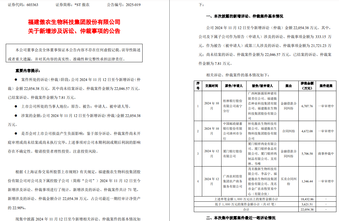 来历:福建傲农生物科技集团股份无限公司关于新增涉及诉讼、仲裁事项的通知布告(通知布告编号:2025-019)。