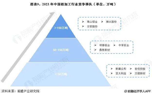 铝加工行业企业数量浩繁,头部企业的产量相对更高。从铝加工企业的2023年产量环境来看,次要分为三个合作梯队:第一梯队的产量跨越150万吨,代表企业有南山铝业、神火股份和云铝股份等;第二梯队产量正在50万吨至150万吨之间,代表企业有明泰铝业、中孚实业和鼎胜新材等;第三梯队铝加工成品产量小于50万吨,代表性企业有亚太科技和万顺新材等。