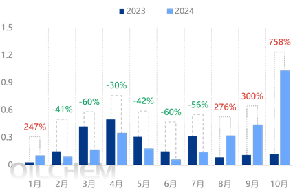 从1-10月份丁酮出口环境来看,出口量较客岁同期较着增加,特别是10月份单月出口量高达1。03万吨,出口低点正在6月份,出口量正在0。06万吨。从出口均价来看,取国内市场价钱走势趋同性不强,一般出口操做需要考虑找船的时间和运费以及套利窗口等问题。