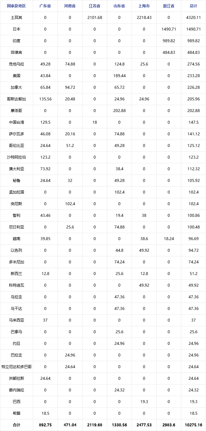通过上表数据能够看出,10月份出口至土耳其的量正在4320。11吨,此中江苏省出口2101。68吨,上海市出口2218。43吨。