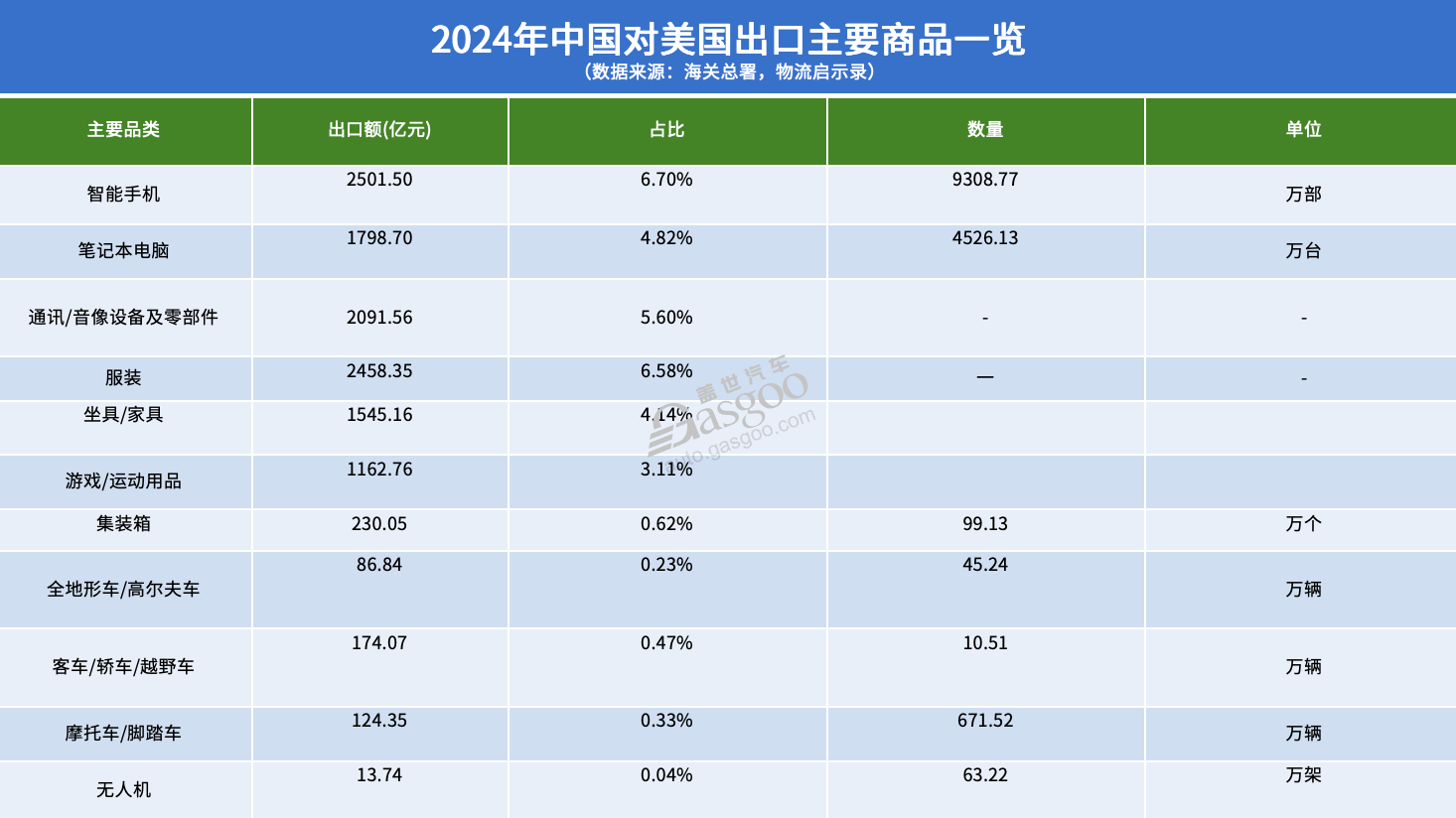 4月2日,美国颁布发表实施“对等关税”办法,对全球商业伙伴实施这一政策,并对中国商品加征34%的关税。这一决定当即激发全球市场的强烈反映,股市大幅下跌,全球经济阑珊的担心情感加剧。两天后,4月4日,中国颁布发表采纳反制办法,决定对所有美国进口商品加征同样的34%关税,并实施出口管制等一系列办法。中美商业和敏捷升温,给两国的经济关系带来了史无前例的压力,同时全球供应链和商业系统也陷入了不确定性。这场商业冲突不只影响中美双边商业,还可能从头塑制全球商业款式,深远影响世界经济。分析多方数据,业内对中国对美进出口产物进行了梳理和阐发,切磋了哪些范畴和财产将遭到更大影响。中美商业是全球经济的焦点构成部门。按照数据显示,2024年,中国对美国的出口总额为37337。2亿元,连结了较着的商业顺差。阐发两国进出口商品布局能够看出,存正在显著的财产互补和分工特点。中国对美出口的次要产物以机械电子类产物为从,总值为15475。84亿元。智妙手机(2501。50亿元)、笔记本电脑(1798。70亿元)和通信/音像设备及零部件(2091。56亿元)是次要的出口商品。此外,纺织鞋服类产物(4686。26亿元)和家具/玩具/活动杂项成品(4594。61亿元)别离占出口总额的12。55%和12。31%,配合形成了中国对美出口的三大支柱。而中国从美国进口的商品布局则以高科技和资本类产物为从。机械电子类产物占进口总额的23。17%(2697。30亿元),此中集成电(838。77亿元)和半导体系体例制设备及零部件(319。46亿元)是环节构成部门。这反映出中国正在高端芯片和半导体设备范畴仍较依赖美国。