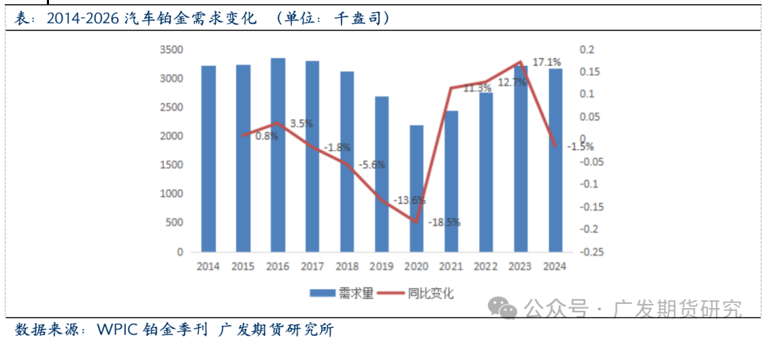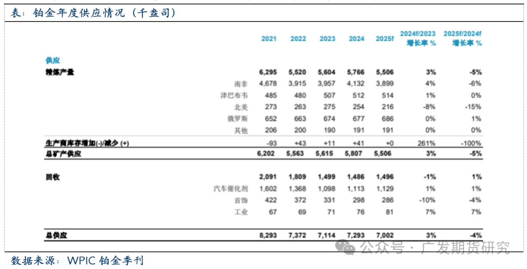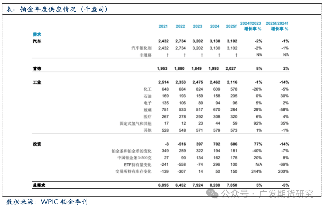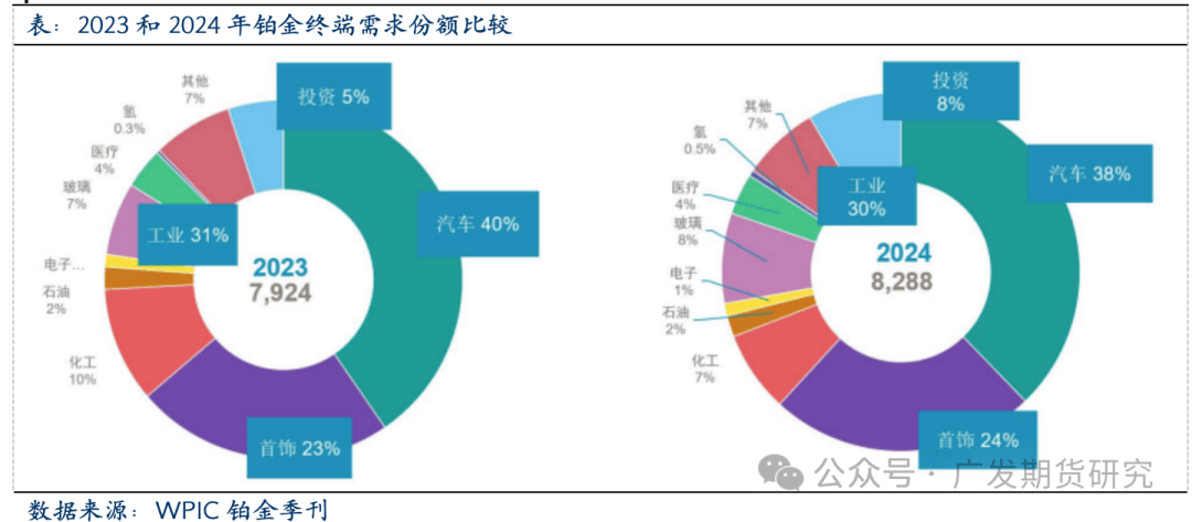 2016-2019期间,全球再生铂供应不竭添加,CAGR为2。8%,2019年增加至202万盎司(57。3吨),创汗青新高。但跟着新冠疫情取半导体危机的接连冲击,2020后再生铂供应持续收缩,CAGR降至-8%,2024年同比下降1%至148。6万盎司(46。7吨),相较2019年的高峰下降26。4%。2024年铂金正在汽车催化剂收受接管量增加了5%,次要得益于中国正在放宽报废汽车催化剂收受接管的后恢复到一般收受接管程度。此外,中国从2024年上半年推出的报废激励办法中起头看到晚期增加,该办法正在2024年下半年进一步添加。首饰收受接管来历的供应量下降了13%(1。1万盎司),日本和中国的收受接管量均有所下降。这标记着日本首饰收受接管量持续第八个季度同比下降。正在中国,2024年第四时度铂金首饰回购量同比下降9%,次要缘由是价钱持续疲软。下降的程度还因为2023年第四时度的高基数所致,其时珠宝商从零售地产转向黄金珠宝导致去库存。电子废料收受接管量增加了10%,受益于人工智能驱动的数据核心升级加快。铂族金属收受接管有益于资本轮回操纵和满脚供应。欧美日等发财国度对废旧贵金属的收受接管操纵起步较早,通过对二次资本收受接管的环节环节加以结构和搀扶,构成了系统化的财产链运做机制。从铂再生供给的地区分布察看,铂金的收受接管区域以欧洲、以及日本等经济发财地域为从,其欧取占全球再生铂供给总量58%。全球再生铂供给集中于欧洲、和日本,其欧取合计占比58%。2023年以29%的份额初次超越西欧(28%),日本和中国别离占16%和12%。此中,中国是铂金资本收受接管的沉点方针市场。国内汽车、石油、电子、化工、医药等行业对铂等贵金属材料需求量日积月累,大型贵金属公司均把中国做为贵金属二次资本收受接管沉点方针市场,操纵其资本、手艺和品牌劣势,正在国内市场所作中占领从导地位。如贺利氏正在南京投资扶植贵金属收受接管工场,中国区收受接管能力提拔至3000吨,占总公司收受接管能力25%。庄信万丰正在张家港投建了3000吨/年贵金属催化剂收受接管项目,估计年产铂1。8吨。别的,从地区角度察看,受政策及废料来历影响,铂金收受接管正在中国具有较着的集聚性,浙江、江苏、江西、湖南、云南等地依托政策支撑和废料来历劣势构成财产集群,收受接管来历凡是包罗电子废料、废催化剂、失效化工催化剂、首饰等。2024年,铂金总需求为828。8万盎司,较2023年增加5%。汽车需求合计为313万盎司,较2023年下降2%,缘由是轻型含催化剂车辆(包罗纯内燃机车辆和混动车)产量下降2%,及沉型车辆(HDV)产量下降5%。因为欧洲创记载需求、市场强劲需求(本地全体珠宝市场疲软)、中国市场小幅增加1%(市场趋于不变)以及印度同比增加31%的提振,铂金首饰需求同比增加8%至193。3万盎司。印度市场的持续强劲表示得益于越来越多的珠宝商展现铂金珠宝以及强劲的出口。工业铂金需求同比下降1%,此中化工需求下降26%,抵消了其他工业范畴的需求增加,出格是玻璃行业需求增加29%,固定式氢气及其他范畴需求增加92%(基数较小)至44万盎司。投资需求是线万盎司。铂金条和铂金币的需求合计为356万盎司,ETF持仓增加296万盎司,买卖所库存添加5万盎司,配合鞭策了投资需求的增加。全球的铂金需求呈现低迷取苏醒的周期性变化。2016-2019期间,全球铂金总需求CAGR为-3。8%。2020年受疫情影响,总需求下跌14。3%至600万盎司,为近十年来最低;此中首饰类需求量-25。4%,汽车催化剂需求量-15。0%;同年,矿端供给下跌18。9%,总供给下跌17。2%,导致铂金价钱正在供需双弱布景下上涨2。3%。2020-2023期间,受益于汽车催化剂及工业铂金需求的持续扩张,全球铂金总需求CAGR达到6。7%,此中汽车催化剂铂需求CAGR为13。5%,工业铂金总需求CAGR升至5。6%。需求反弹鞭策了铂金价钱沉心正在2021年同比增加23。52%,但随后两年因为铂金积压库存过多(2022年全球铂金地面存量达到1032万盎司),因而铂金价钱增加不如预期,两年价钱同比增加别离为-11。90%取0。47%。周期性的数据显示全球铂金市场的需求形态曾经恢复不变,汽车催化、工业以及氢能行业的成长取成长或是后期推升铂金行业需求扩张的焦点要素。