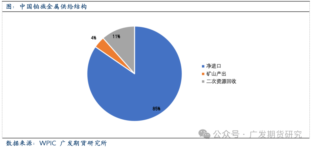 中国铂族金属资本极端匮乏。按照《中国矿产资本演讲2022》的数据,我国铂族金属的总储量仅为87。69吨,而且这一数字还正在持续下降,凸显了我国正在该范畴的资本欠缺问题。从地区分布来看,我国铂族金属的资本次要集中正在甘肃、云南、、四川、新疆和青海等地,此中甘肃的储量最为丰硕,达到了60。14吨,占领了全国总储量的绝大部门,但地区分布不均的环境进一步加剧了我国铂族金属供应的严重场合排场。正在供应端,我国铂族金属的供给严沉不脚。2021年,中国铂族金属的总供给量仅为229。5吨,取上年比拟还削减了4。5%。这一数据表白,我国铂族金属的供应能力正正在逐步削弱,难以满脚日益增加的市场需求。从供给布局来看,我国铂族金属的供应次要依赖于进口、二次资本收受接管和矿山产出三个方面。此中,进口是最次要的供应来历,2021年净进口量达到了194。1吨,占总供给量的84。6%。比拟之下,二次资本收受接管虽然也正在必然程度上弥补了我国铂族金属的供应,但其贡献率相对较低,2021年仅占总供给量的11。5%。2021年,矿山产出量仅为9吨,占总供给量的3。9%,我国铂族金属供应中的地位较为边缘化。这一数据不只反映了我国铂族金属矿山资本的匮乏程度,也了我国正在铂族金属开采和加工方面的手艺瓶颈和挑和。中国铂族金属的进口依赖度高达86。5%,这一数据凸显了我国正在该范畴的资本欠缺和对外依赖的严峻现实。2023年,中国铂金的进口量约为101。8吨。